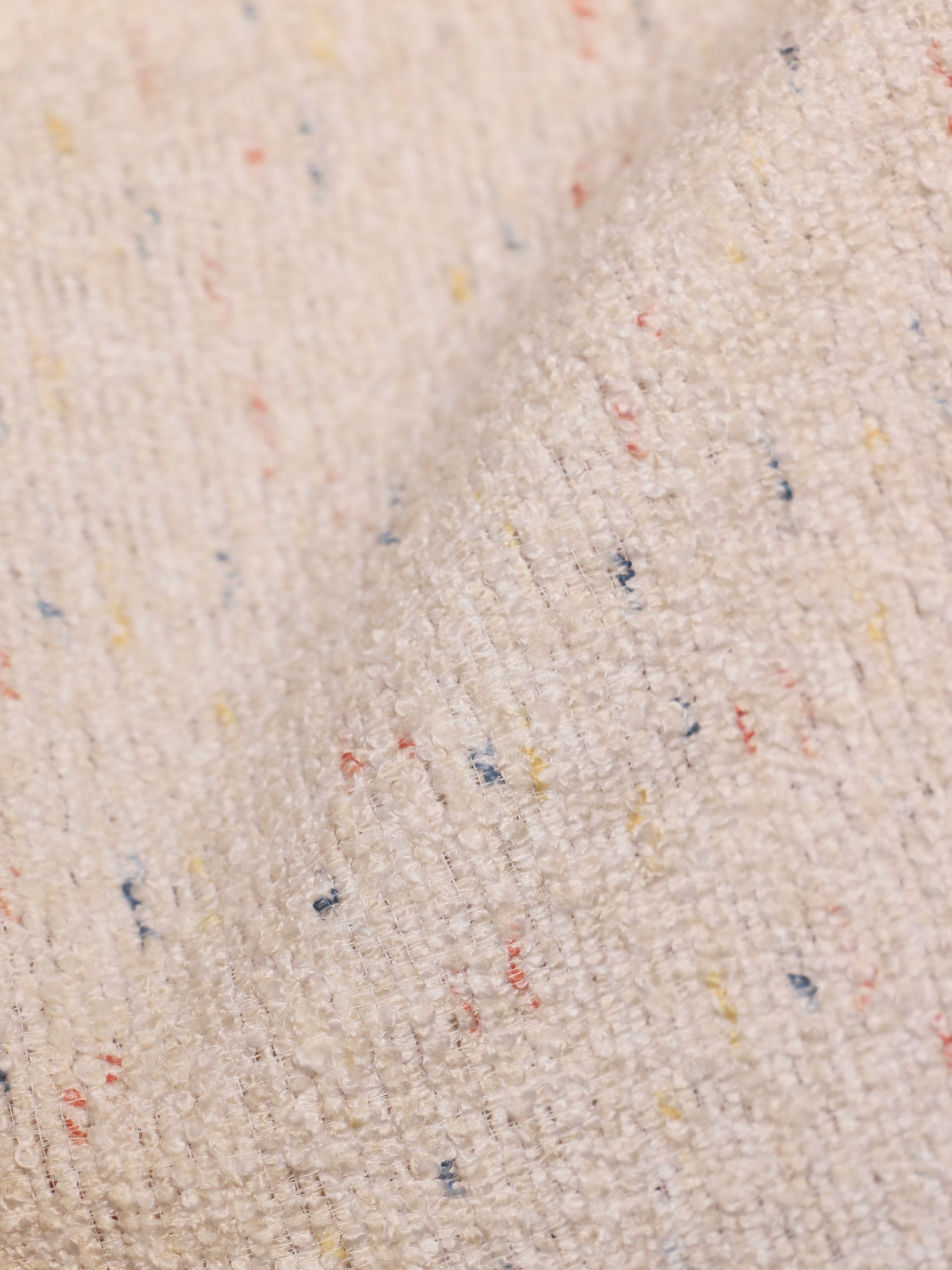 Bring softness and spontaneity to your interiors with Ivory Speckle, a lightweight sheer fabric in a creamy base, delicately scattered with multicolored yarn flecks in red, mustard, and navy. The playful dotted texture adds a lively, modern charm while maintaining an understated look.