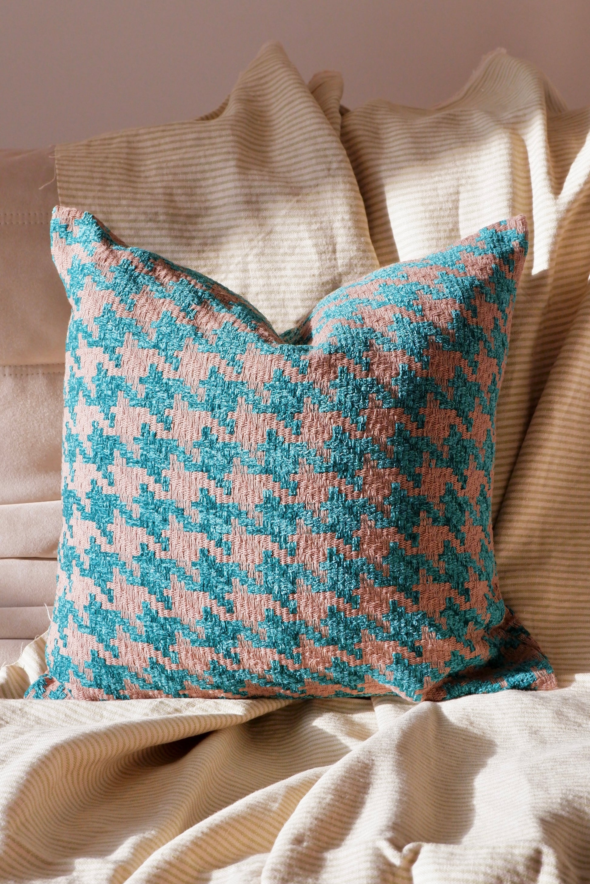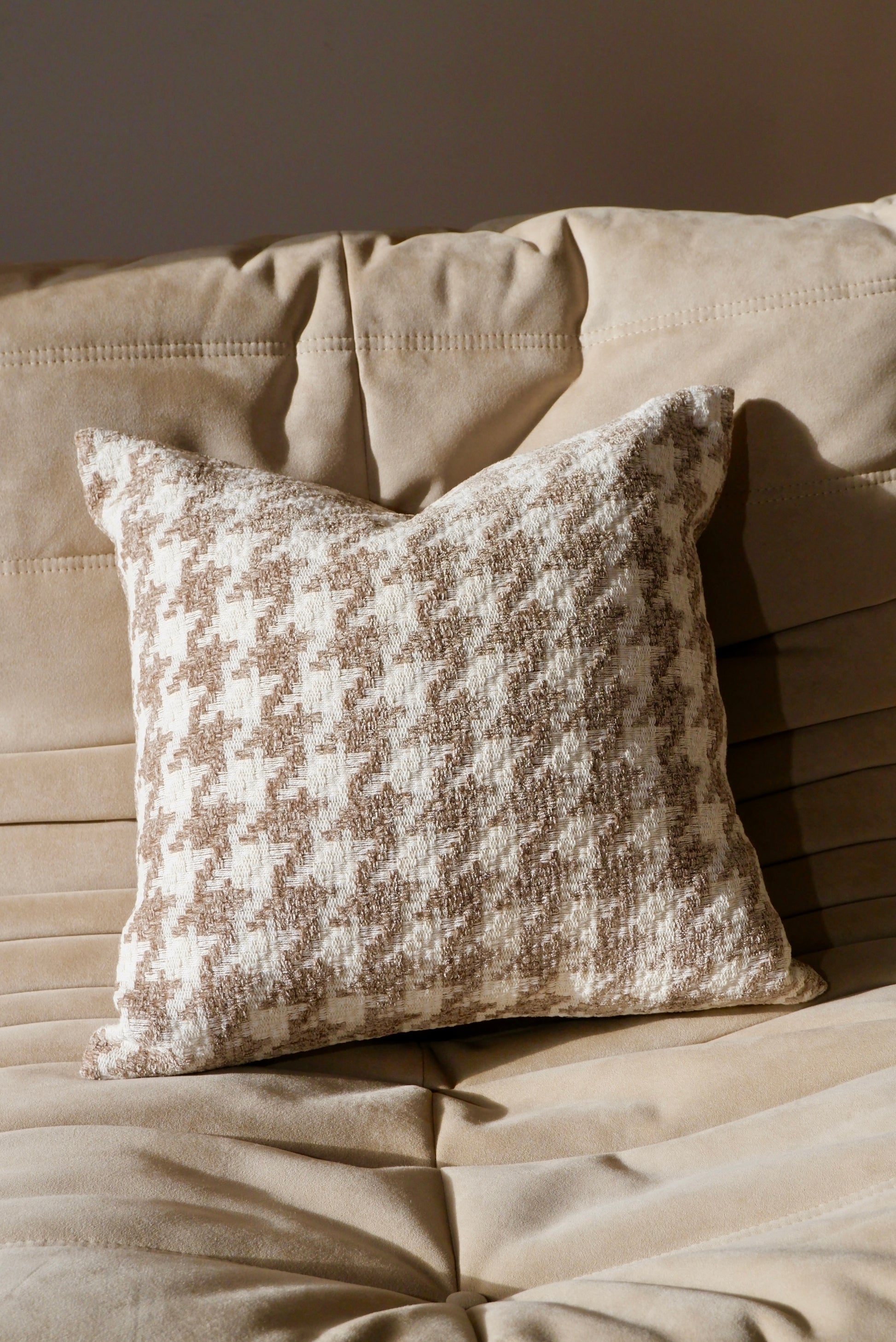The Ferrosa Collection features a distinctive geometric jacquard pattern that balances structure and softness. The intricate weave creates a subtle play of light and shadow across the surface, bringing depth and character to any interior. Its tactile texture and refined tone make it ideal for both contemporary and classic spaces.